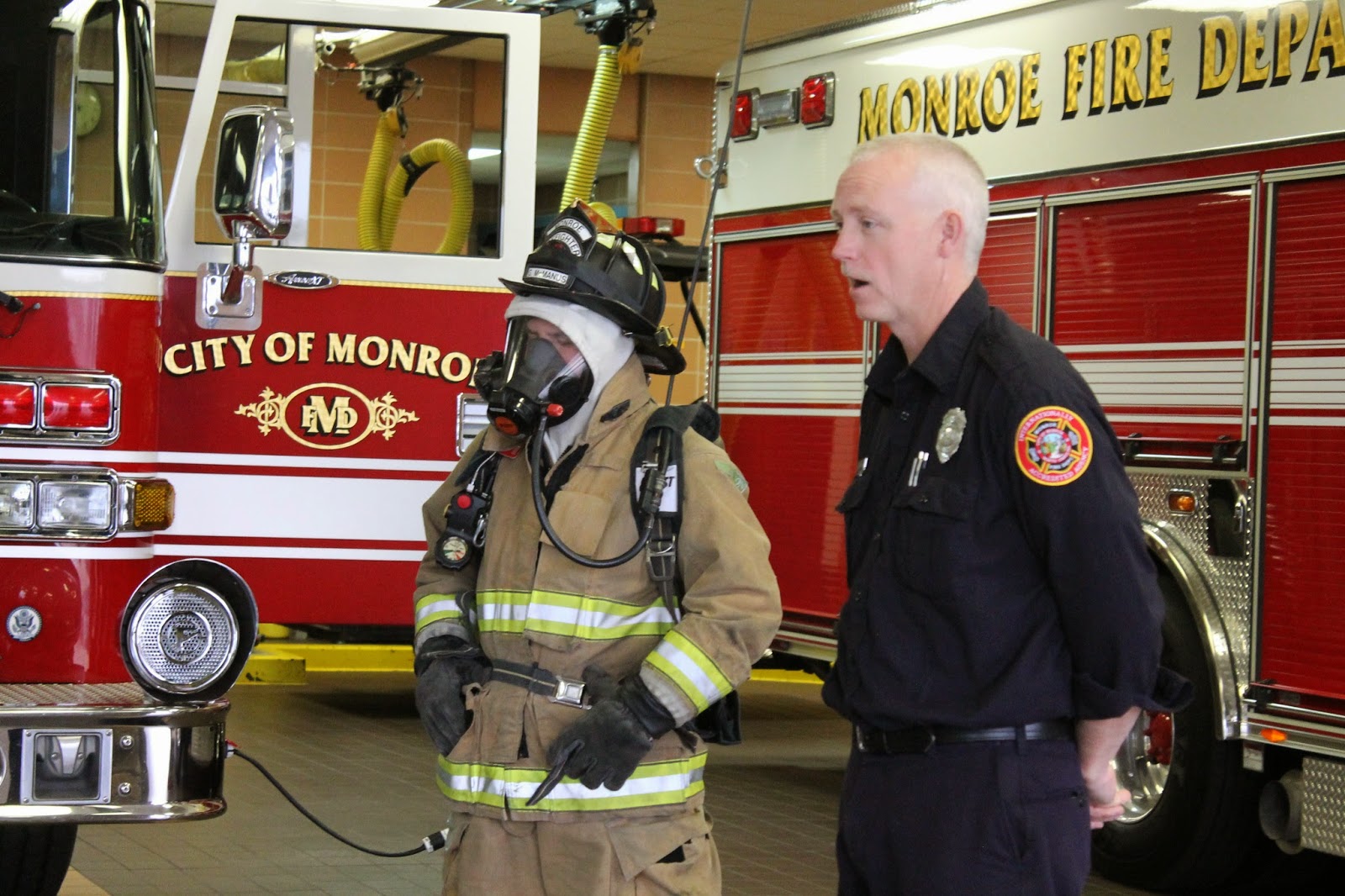 In February I was so excited to be able to attend Kennedy's class field trip. Thanks to my Mom for keeping my "littles". There were three stops on this particular field trip and first up was the Monroe Fire Department. After showing us their garage and the three trucks inside and the differences in each they talked a bit about fire safety and then showed the kids how they "suit up" for a fire.