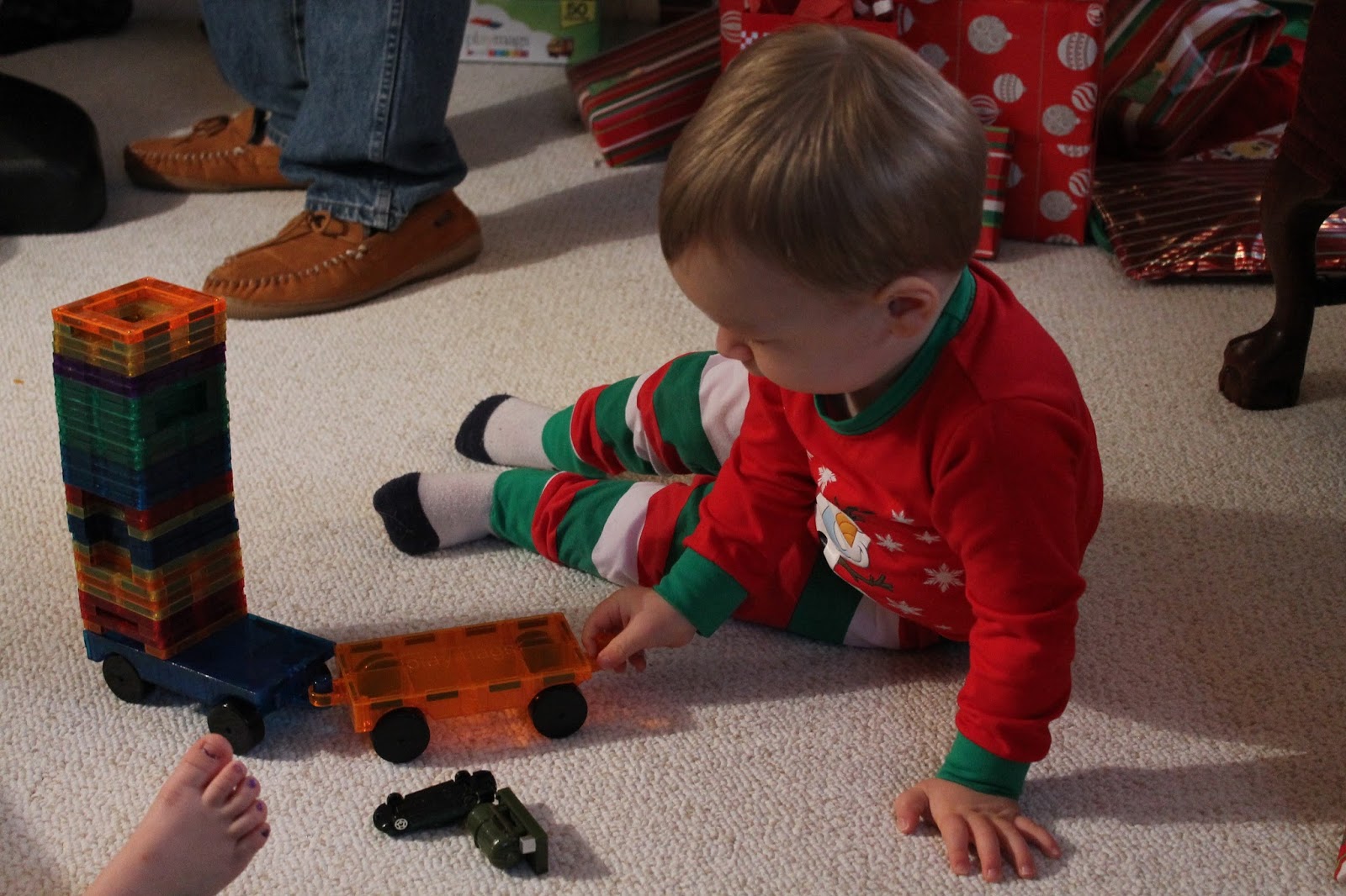 These! These things are/have been AWESOME. There are lots of versions of these on the market but ours in particular are called Playmags. They are magnetic tiles and I first saw them at a children's museum in Rock Hill near my Moms house and the kids loved them so much there that I thought we'd get some for the house. Seriously: I can say this now 11 months removed from them opening them - they play with them all.the.time. There are so many cool things that they construct and use them for. It's nuts. My only regret: not getting the larger set (they came in two sets and I got the smaller sets that didn't have triangles in it. I ended up purchasing a supplemental set for Grey's birthday in August but I wish I would have just bought the 100+ piece set right out of the gate because it would have been worth it. Anyhow - I suggest you look in to them if you're trying to decide on a cool and creative Christmas gift for this season.